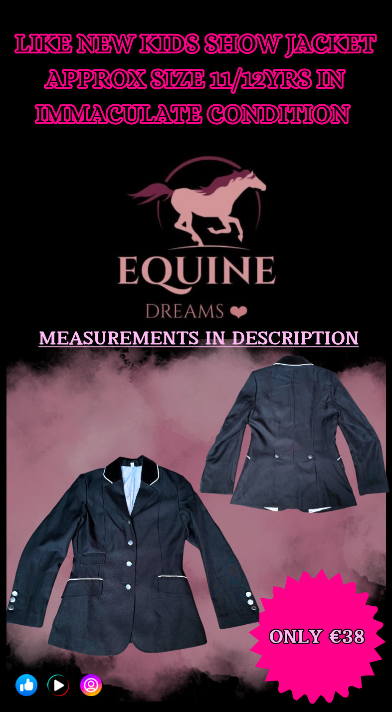 A stunning black show jacket featuring a velvet collar – classic and elegant! In immaculate condition and ideal for young riders looking for a smart, stylish finish in the ring.