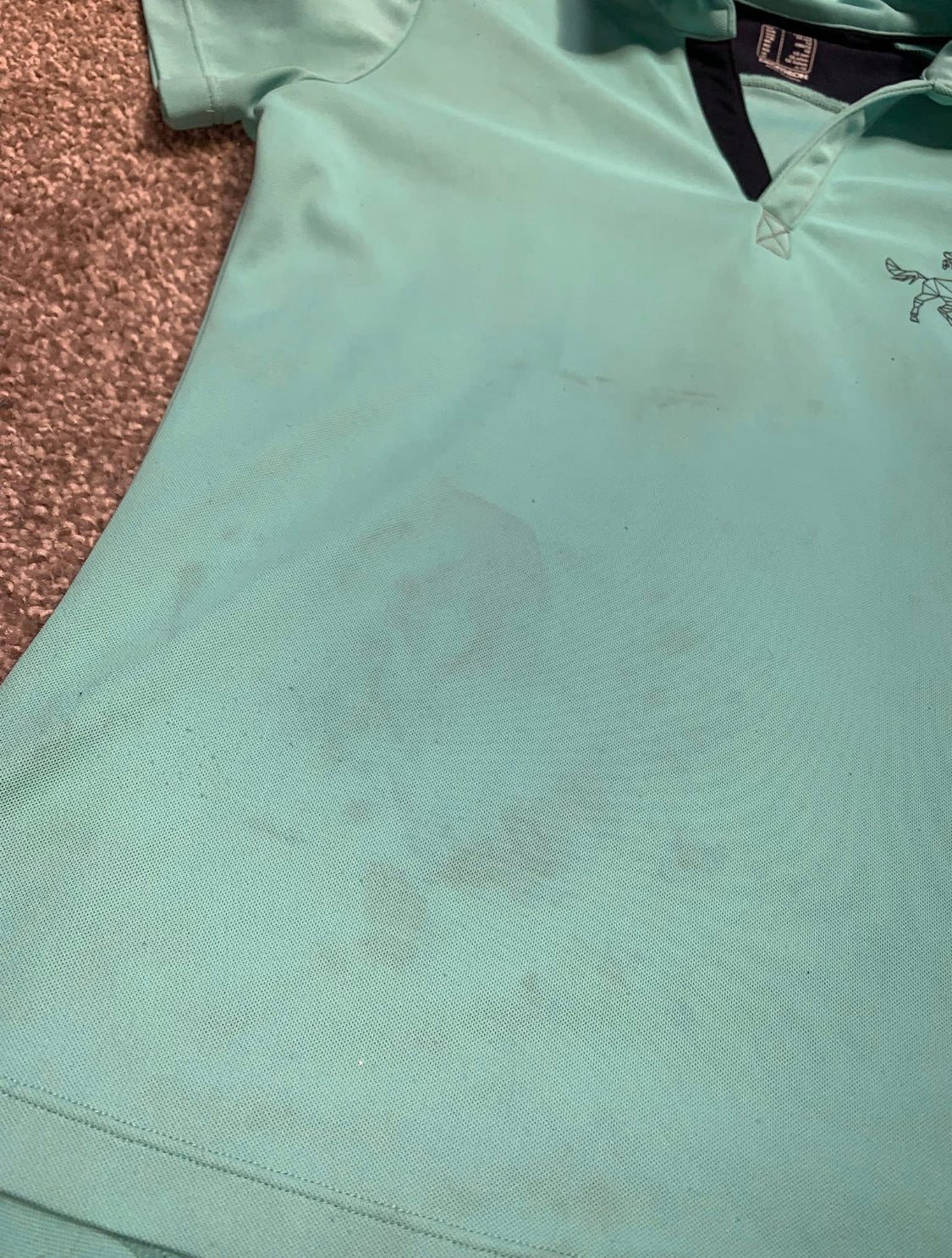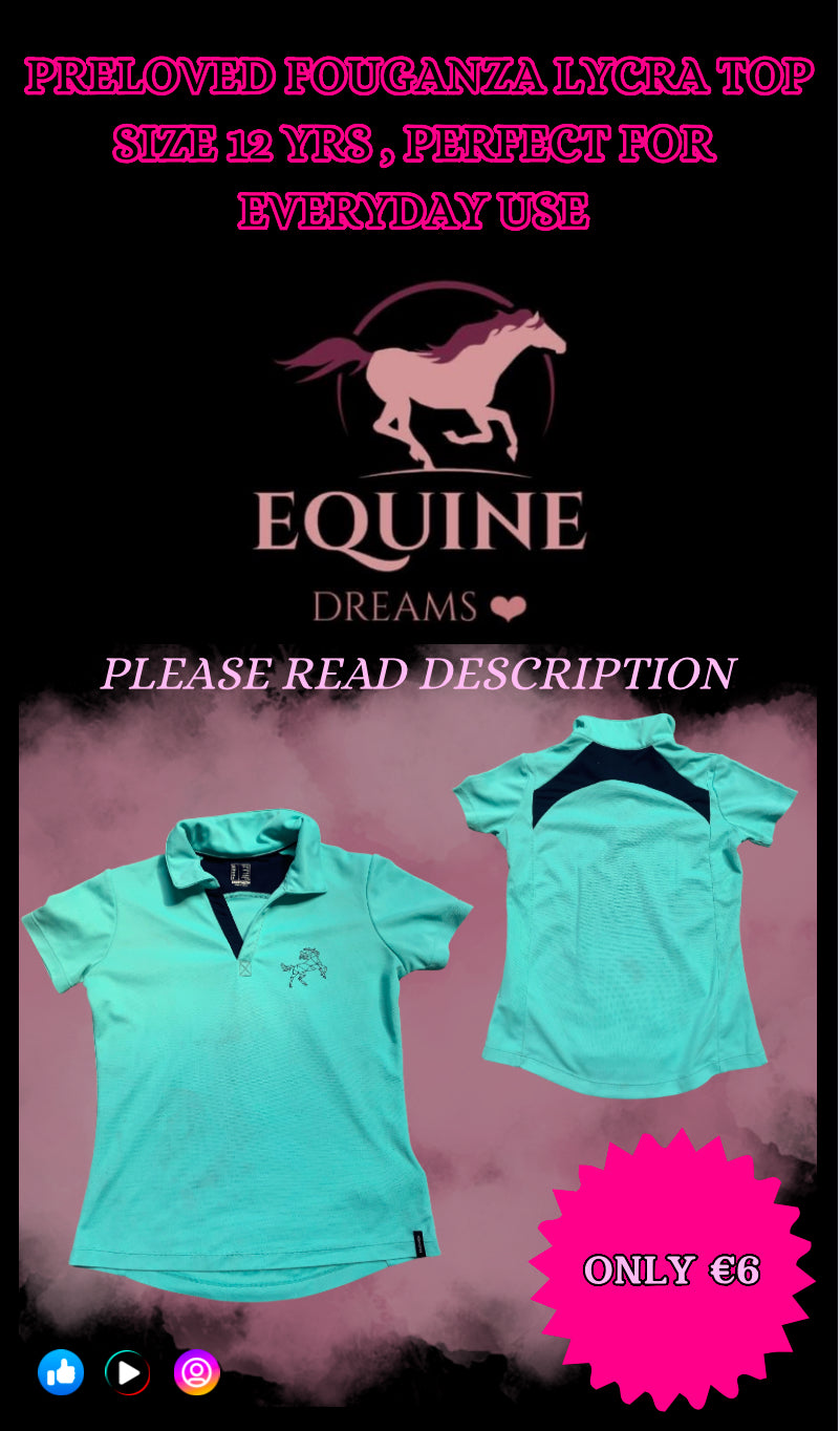 Lightweight and comfy, this Fouganza Lycra top is ideal for everyday yard wear! It has some light stains (as shown in photo), but still plenty of life left in it.