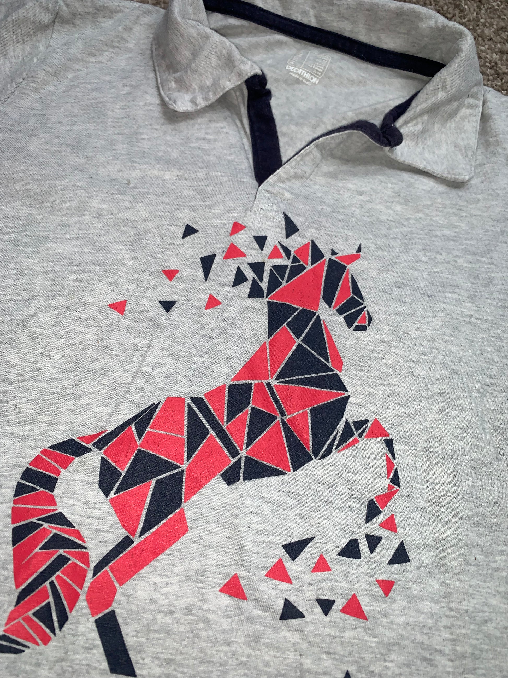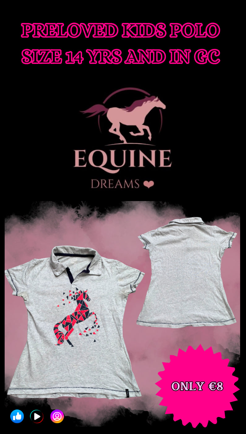 Lovely grey polo featuring a pink & black horse design 🐎 Perfect for everyday wear! Tag reads 14yrs but appears to be a smaller fit.