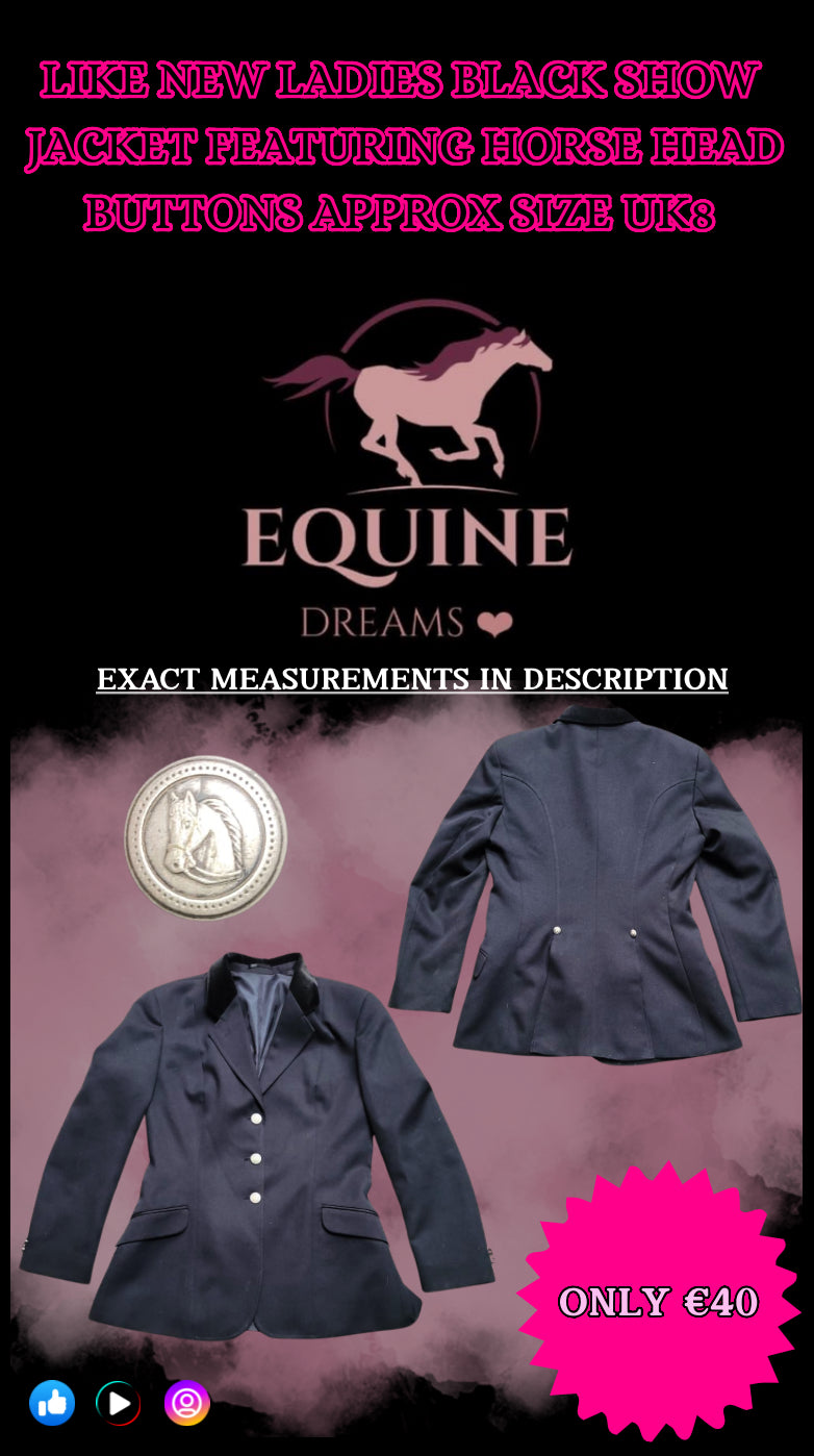 Beautiful black show jacket featuring elegant horses head buttons throughout. Like new condition – a timeless and classy piece for competition or everyday equestrian wear.
