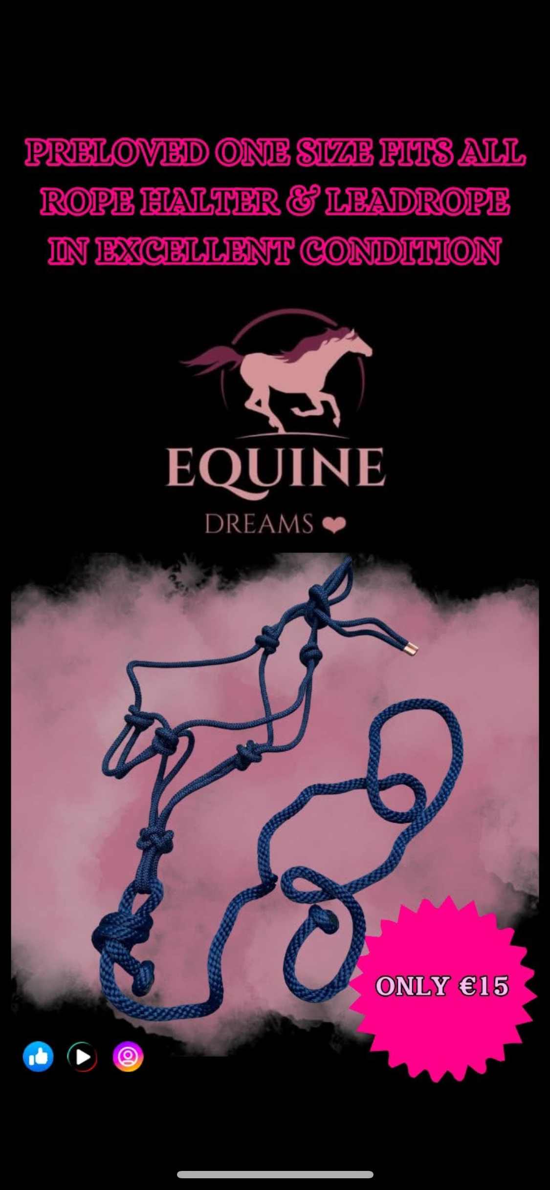 Gorgeous one size fits all rope headcollar and matching leadrope set in excellent condition. Elegant navy with rose gold detailing โ perfect for everyday use or a touch of style at shows.
