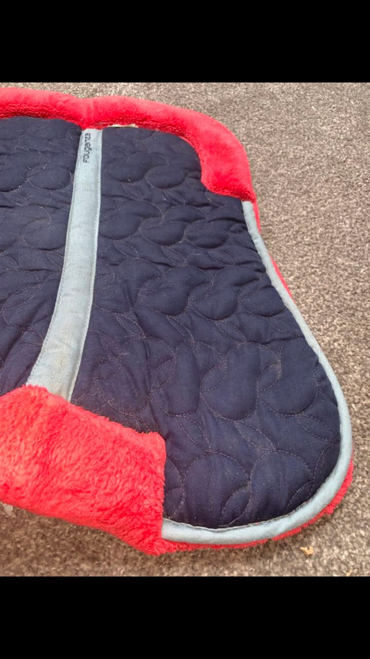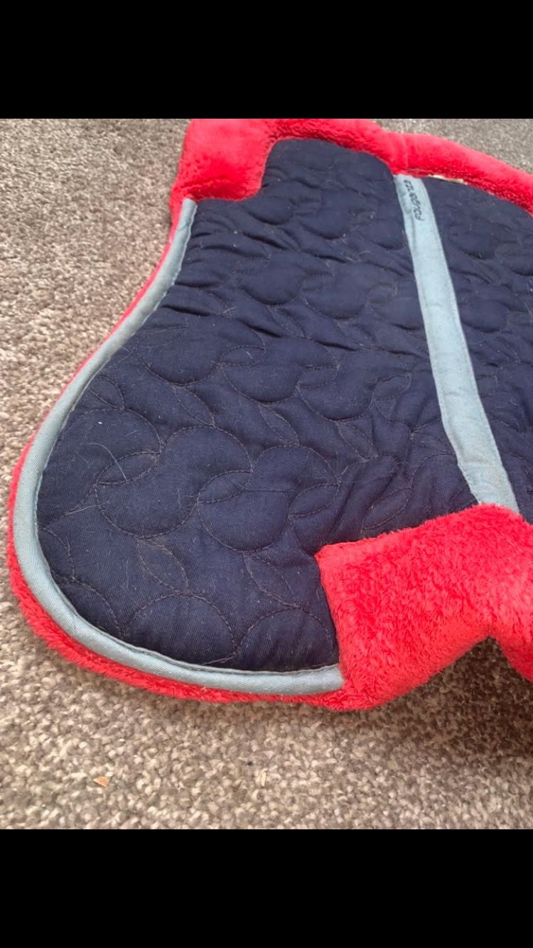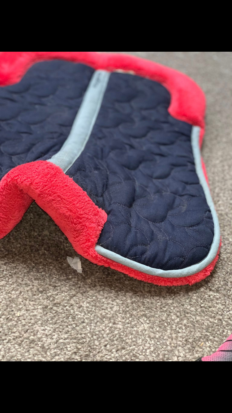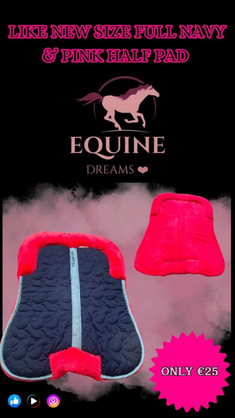 Stylish navy & pink half pad in like new condition โ offers excellent comfort and support under the saddle while adding a pop of colour to your tack.